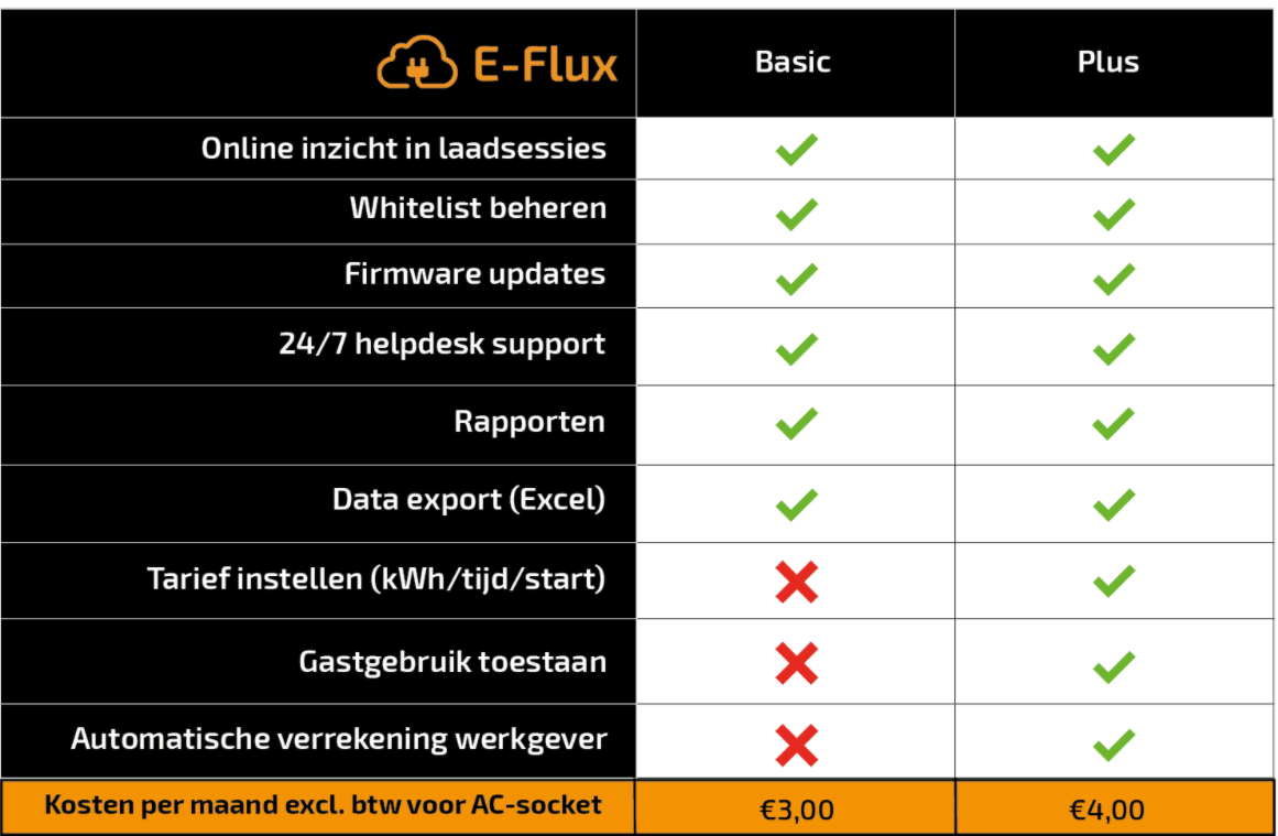 - De kosten voor E-Flux bedragen 3 euro per maand voor het Basic pakket en 4 euro voor het Plus pakket. Zie de laatste foto voor de inhoud van de E-Flux pakketten. Het Basic pakket ontvangt u 6 maanden gratis na uw aankoop.