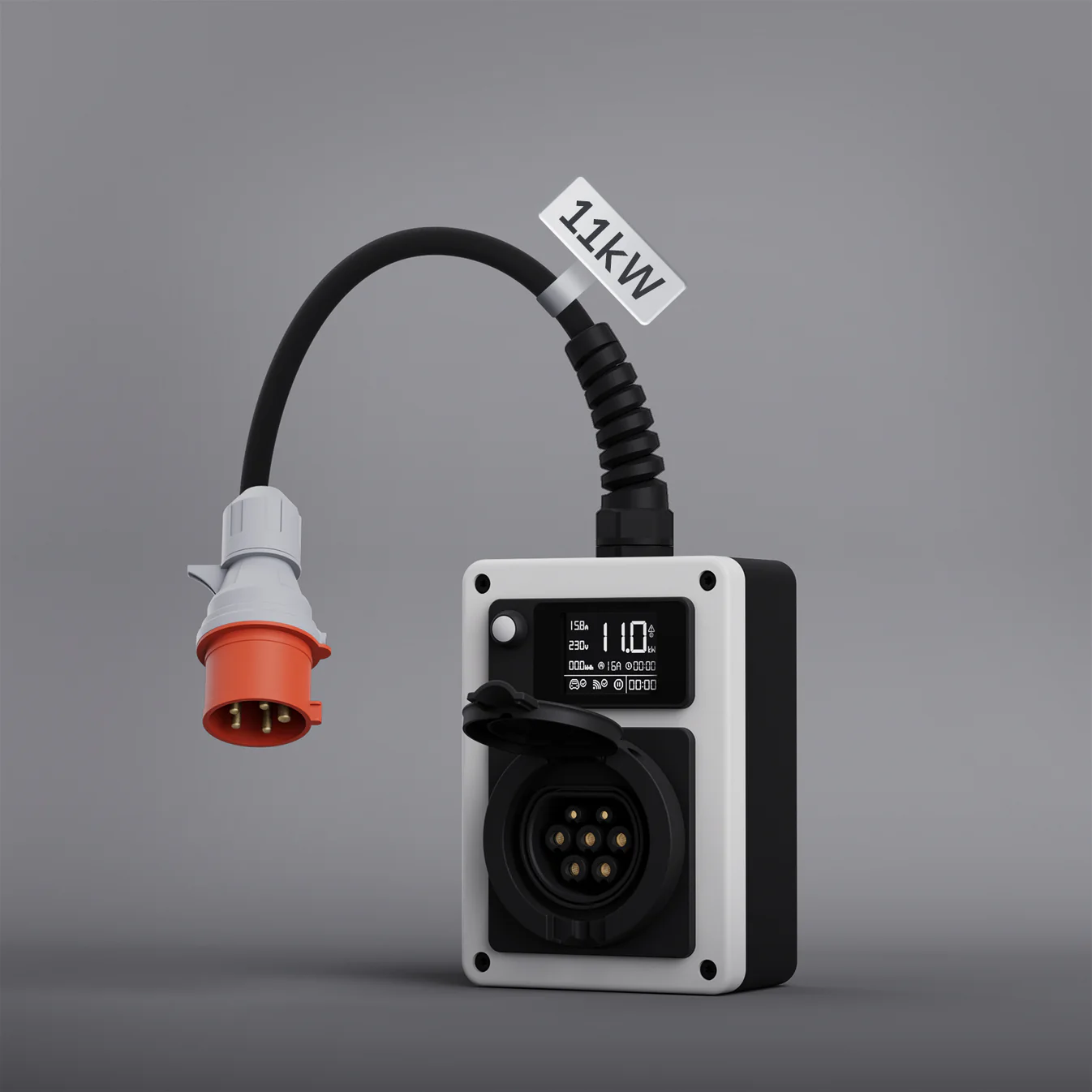 Dit draagbare laadstation wordt gebruikt het opladen van elektrische voertuigen (EV's) vanaf een zogenaamd "CEE" stopcontact (IEC 60309-2) van 16A.
