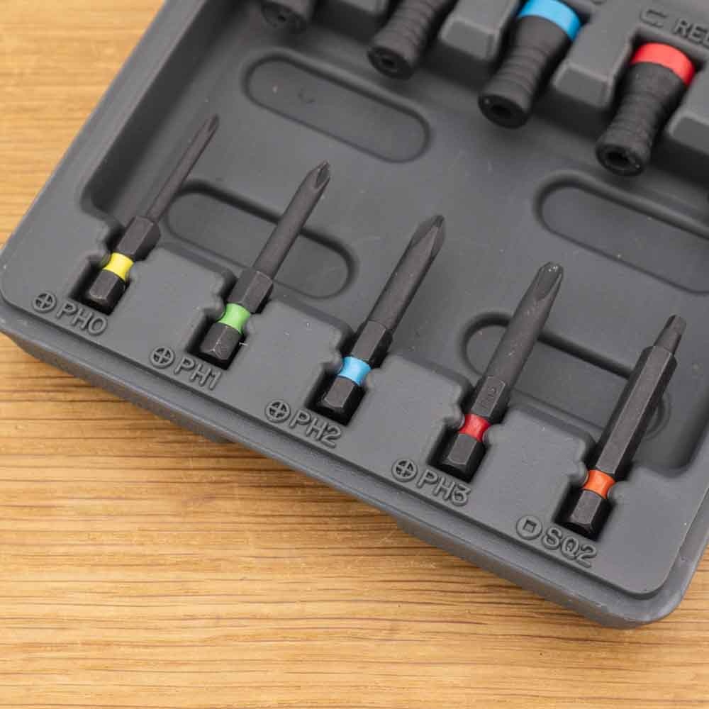 De verschillende kleuren magnetische bits passen op een verscheidenheid aan schroevendraaiers. Ze passen natuurlijk op de meegeleverde schroevendraaiers, maar ook op veel standaard schroevendraaiers en lange schroefbits voor een accuschroefboormachine.