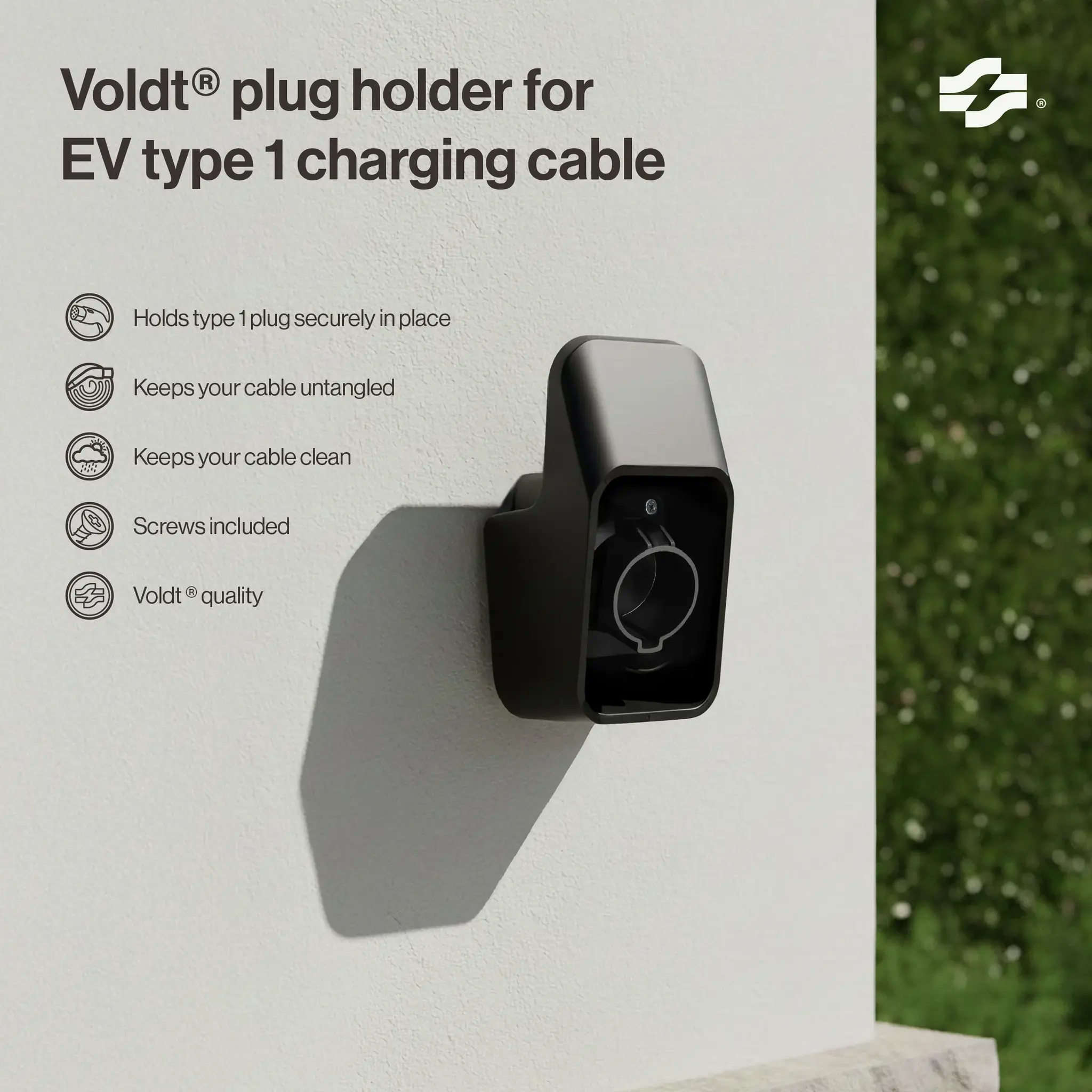 Met deze Voldt Plug Holder/ Cable Dock/ Cable Holder/ Stekkerhouder kunt u de stekker van uw laadkabel gemakkelijk en netjes opbergen. U kunt de stekker gemakkelijk uitnemen om het laden te beginnen. U kunt ook de kabel 1 of 2 slagen om de houder ophangen om zo de kabel netjes schoon en droog te houden. Deze houder is geschikt voor type 2 stekkers.